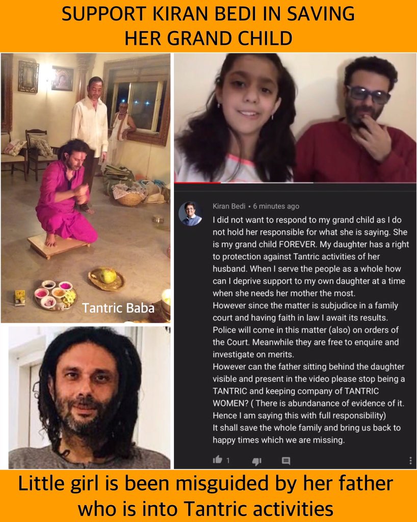 Kiran Bedis granddaughter this little girl has mustered courage to go public against harassment meted out to her father by her mother and grandmother. Today evening around 7 pm Pune police arrested the only son-in-law of Kiran Bedi in kidnapping of his own daughter.